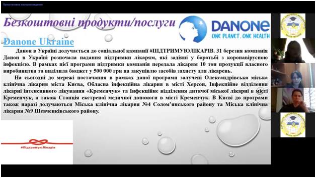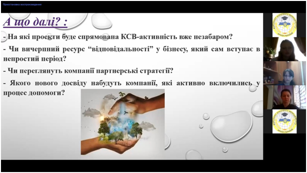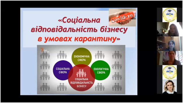Кристина Драмарецька, продовжуючи лекцію, навела приклади реалізації соціальної відповідальності бізнесу в умовах пандемії коронавірусу. Було зазначено, що бізнес несе свою відповідальність за ситуацію в країні – корпоративну та соціальну. Підприємці готові надати суспільству підтримку у справі захисту від вірусу, покращення ситуації в країні.