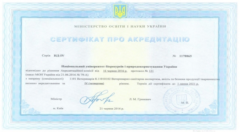 Відповідно до рішення Акредитаційної комісії від 16 червня 2016 р. за протоколом № 121 (наказ МОН України від 21.06.2016 № 79-А) Національний університет біоресурсів і природокористування України зокрема, кафедра ветеринарно-санітарної експертизи, отримала дозвіл здійснювати підготовку лікаря ветеринарної медицини з безпеки та якості сільськогосподарських і харчових продуктів.