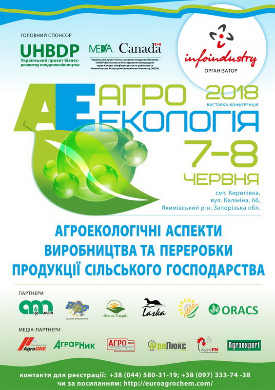 Виставку-конференцію «АгроЕкологія-2018» організували: інформаційна компанія «Інфоіндустрія» у партнерстві з Українським проектом бізнес-розвитку плодоовочівництва UHBDP, який фінансується Міністерством міжнародних справ Канади та Таврійським державним агротехнологічним університетом.