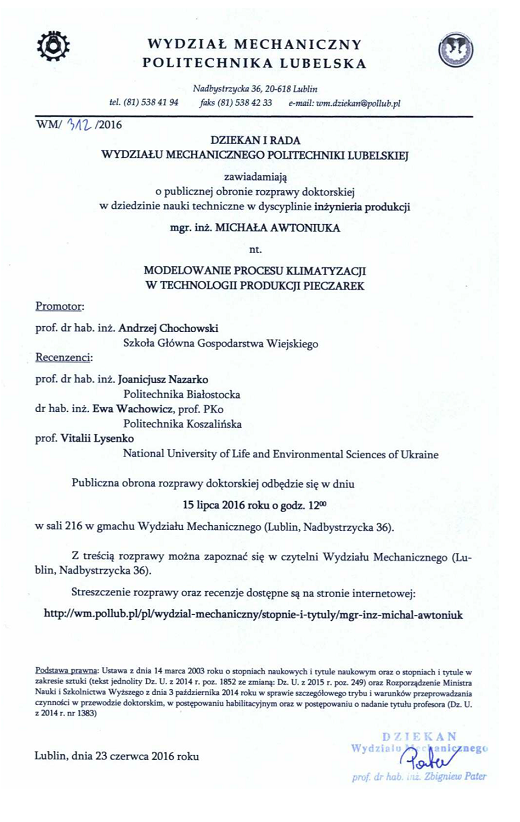 15 липня 2016 р. у стінах Люблінської політехніки (Польща) відбувся публічний захист докторської дисертації Міхала Автонюка «Моделювання процесів кліматизації в технології виробництва грибів» (науковий керівник професор, завідувач кафедри Варшавського університету наук про життя Анджей Хоховські, який активно бере участь у програмі подвійних дипломів, що діє між SGGW і НУБіП України).