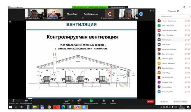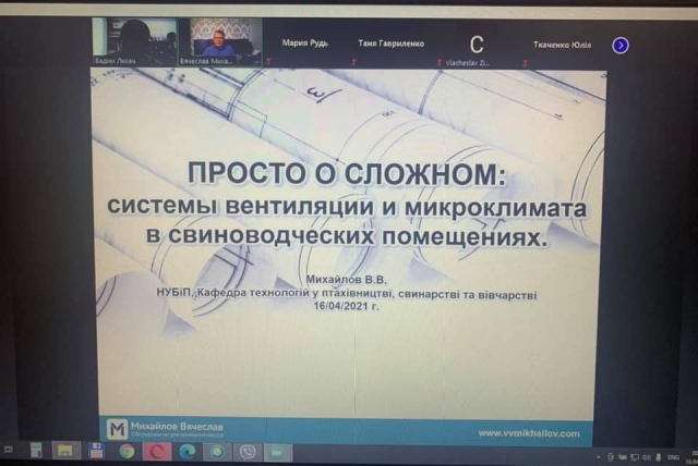 Крім того, у квітні цього року було проведено он-лайн лекцію провідного фахівця в царині технології виробництва продукції свинарства, представника французької компанії «I-Tek» у Східній Європі, директора компанії «МВВ» (аудит систем вентиляції свинокомплексів) – Михайлова В’ячеслава Валерійовича, який представив для студентів ОС «Бакалавр» лекцію на тему: «Вентиляція у свинарських підприємствах». Студенти були ознайомлені з інноваційними технологіями у формуванні мікроклімату для свиней різних технологічних груп. Feedback був присутній, слухачі зацікавлені.