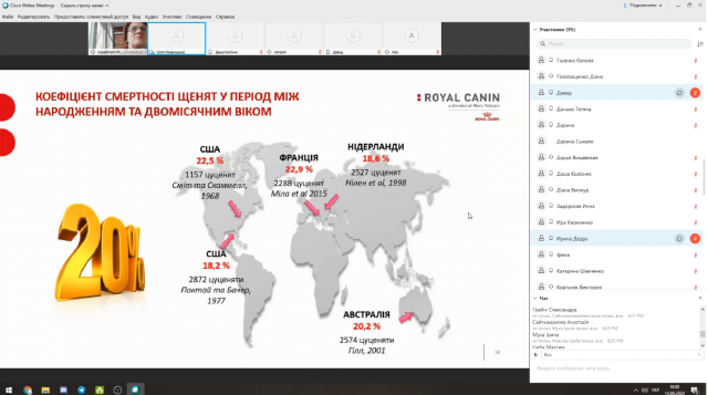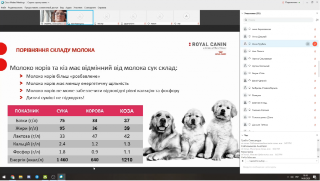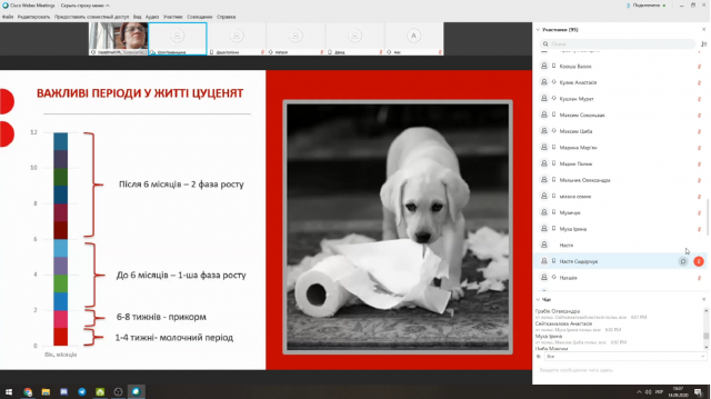 Як годувати собак у різні вікові періоди? Які дієтичні промислові корми сучасних торгових марок використовувати? Нещодавно було проведено практичне онлайн-заняття, на якому студенти вчилися оцінювати раціон домашнього улюбленця та підбирати корми для його корекції. А вже зараз настала черга розібратися з особливостями годівлі собак у різні вікові періоди. Як і попередні заняття, лекцію було організовано 14.09.2020 р. доцентом кафедри терапії і клінічної діагностики Наталією Бойко в онлайн-режимі за допомогою платформи Cisco Webex Meetihg.