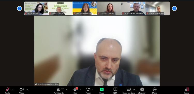 Наступним до вітального слова був запрошений заступник Голови Держпродспоживслужби Володимир КУСТУРОВ, який відзначив актуальність і мультидисциплінарність питання благополуччя тварин, а також впровадження окремих законодавчих документів, які вводяться в дію вже з 01 січня 2026 року.