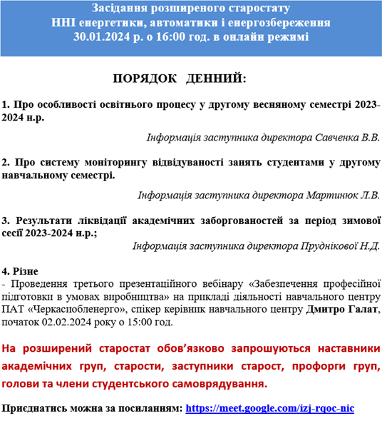 Перед стартом нового семестру в ННІ енергетики, автоматики і енергозбереження традиційно проведиційно проводяться розширені засідання старостату. Цього разу на зібранні були присутні наставники академічних груп. До порядку денного були включені важливі питання щодо особливостей початку освітнього процесу та певних нововведень, пов’язаних з моніторингом відвідування занять студентами.