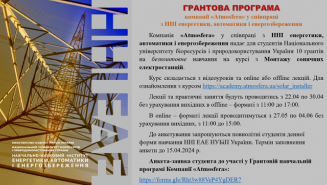 Серед додаткових можливостей опанувати новими компетентностями, які створюють для наших студентів партнери-роботодавці, стало відкриття грантового навчання на програмі «Монтаж сонячних електростанцій». Саме таку пропозицію для десяти слухачів нашого інституту надає учасник Кластеру цифрової енергетики компанія «Атмосфера». Деталі на головній сторінці інституту: https://nubip.edu.ua/node/145324