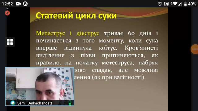 Лікар ветеринарної медицини, а особливо лікар-репродуктолог, повинен в першу чергу, чітко розуміти фізіологію статевого циклу самок. Саме на це лектор, доцент Сергій Деркач, звернув увагу студентів 4 курсу факультету ветеринарної медицини ОС «Магістр» під час проведення онлайн-лекції на платформі Cisco Webex.