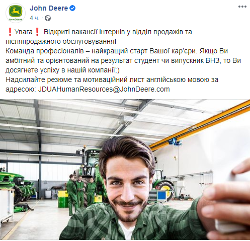 Наше оголошення можна знайти також на нашій офіційній сторінці у Facebook за посиланням https://www.facebook.com/JohnDeereUkraine/photos/a.1773373219656076/2768534103473311/?type=3
