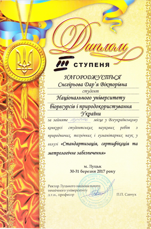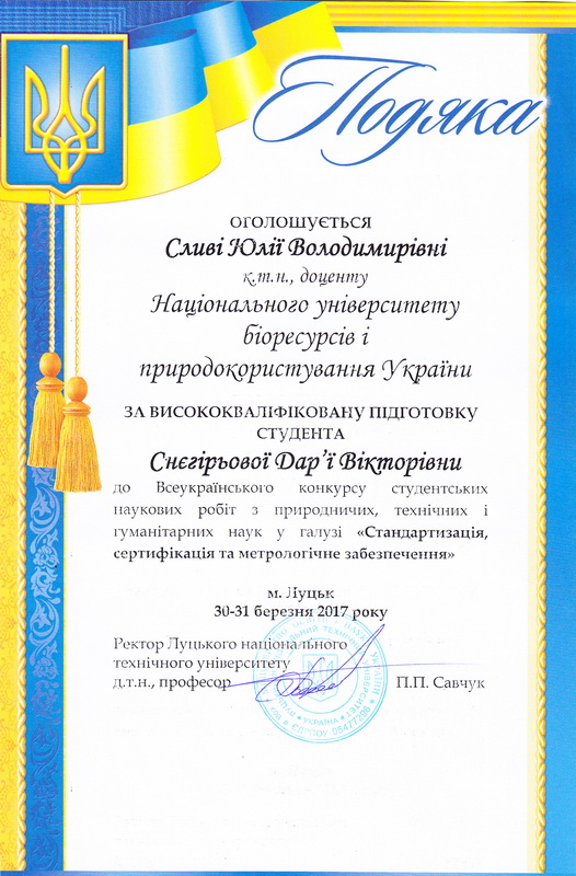 За результатами ІІ туру Всеукраїнського конкурсу студентських наукових робіт у галузі «Стандартизація, сертифікація та метрологічне забезпечення» студентка факультету харчових технологій та управління якістю продукції АПК Дар’я Снєгірьова була нагороджена Дипломом ІІІ ступеня за зайняте 3 місце, а керівник доцент кафедри стандартизації та сертифікації с.-г. продукції Юлія Слива – Подякою за висококваліфіковану підготовку студента.