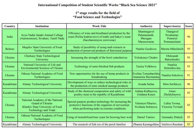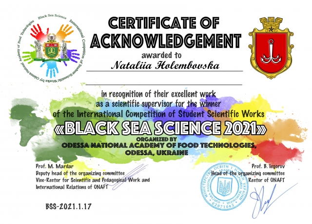1 березня 2021 р. офіційно був завершений перший етап Міжнародного конкурсу студентських наукових робіт «Black Sea Science», який щорічно проводиться на базі Одеської національної академії харчових технологій під егідою Black Sea Universities Network та ISEKI-Food Association. У даному конкурсі був представлений Національний університет біоресурсів і природокористування України зокрема факультет харчових технологій та управління якістю продукції АПК від якого була подана робота від студентки магістратури 1 року навчання Таїсії Волхової під керівництвом доцента кафедри технології м'ясних, рибних та морепродуктів Наталії Голембовської.