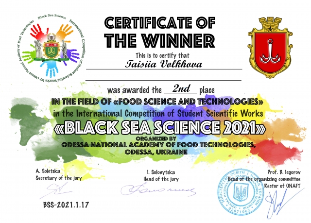 Студентка факультету харчових технологій та управління якістю продукції АПК Таїсія Волхова – призер Міжнародного конкурсу студентських наукових робіт «Black Sea Science»