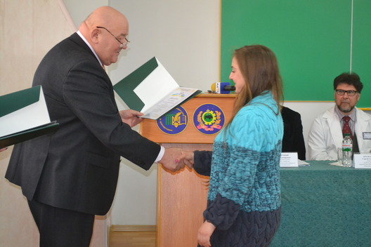Перший проректор МНАУ Бабенко Д. М. нагороджує за ІІІ місце студентку факультету ветеринарної медицини НУБіП України Ярмак Марію