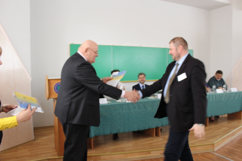 Перший проректор МНАУ Бабенко Д. М. нагороджує за активну участь у проведенні олімпіади доцента кафедри патологічної анатомії НУБіП України Сердюкова Я. К.
