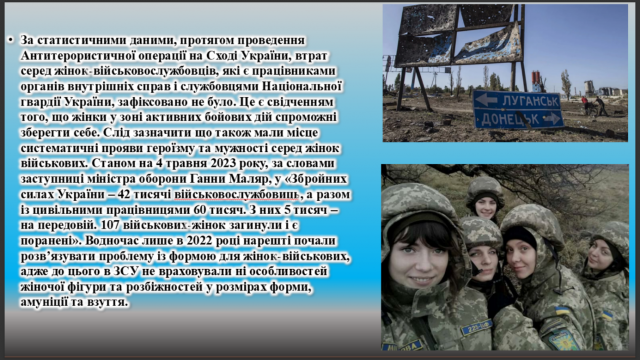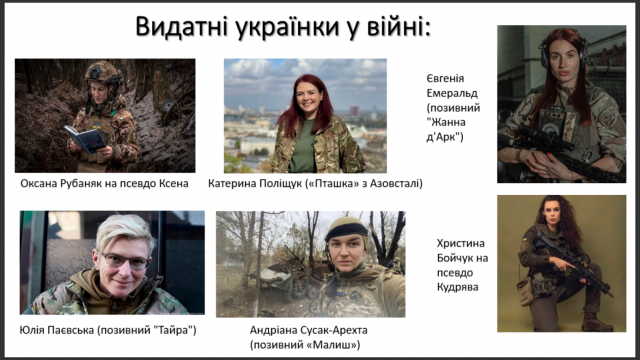 Метою роботи був аналіз гендерних здобутків і проблем в освіті, висвітлення процесів формування гендерної свідомості серед молоді та дослідження стереотипів щодо ролі дівчат і жінок серед освітян та у суспільстві загалом, і, звісно, акцент було зроблено на ролі жінок під час будь-якої війни, а особливо, ролі українок у цій війні проти рф.