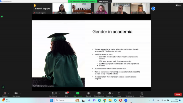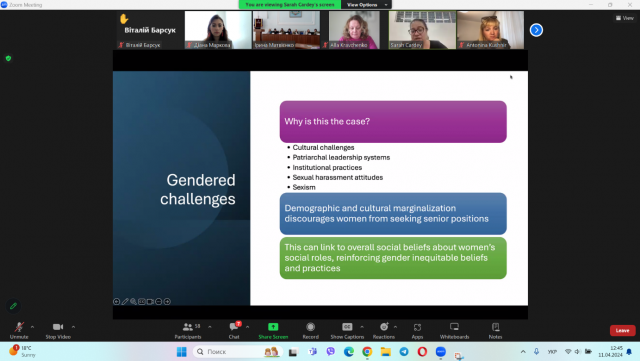 Оскільки мені не байдужа ця тематика, я також підготувала і презентувала доповідь із теми «Гендерні проблеми держави, яка воює: роль освіти і соціуму в їх вирішенні» (науковий керівник – к. пед. н., доцент кафедри громадського здоров’я та нутриціології Альона Борисівна Альтанова).