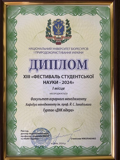 У межах відзначення 126-ї річниці НУБіП України в Університеті 27 травня 2024 року відбулося нагородження кращих студентів базового закладу, які продемонстрували здобутки в навчанні, мистецькій діяльності, на науковій ниві та у спорті. Ректор університету Станіслав Миколайович Ніколаєнко, зокрема, нагородив дипломом І ступеня ХІІІ «Фестивалю студентської науки – 2024» Сіденко Вікторію як старосту студентського наукового гуртка «ДНК Лідера».