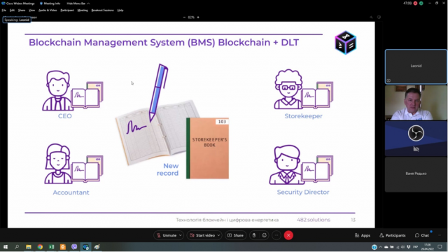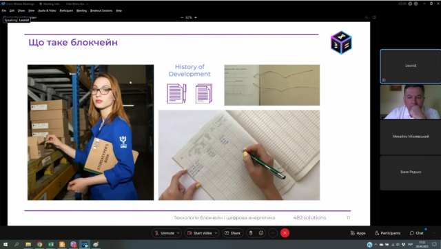 Спікер вебінару Леонід Хацкевич, директор з розвитку компанії 482.solutions, у своїй презентації досить лаконічно, але дуже інформативно розкрив базові поняття технології blockchain та створення програмних платформ для бізнесу на її основі.