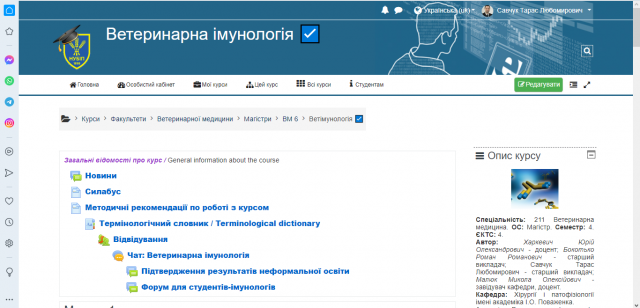 Також, здобувачі вищої освіти використовували електронний навчальний курс дисципліни «Ветеринарна імунологія», який розміщений на платформі Elearn (https://elearn.nubip.edu.ua/enrol/index.php?id=434).