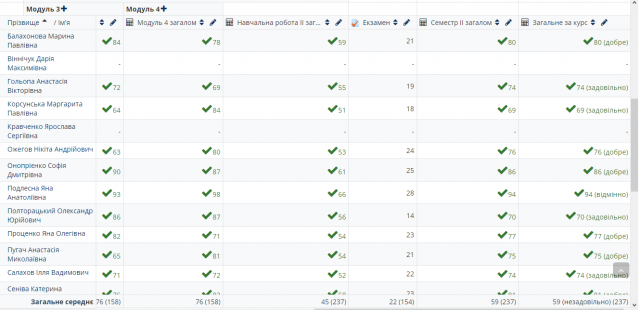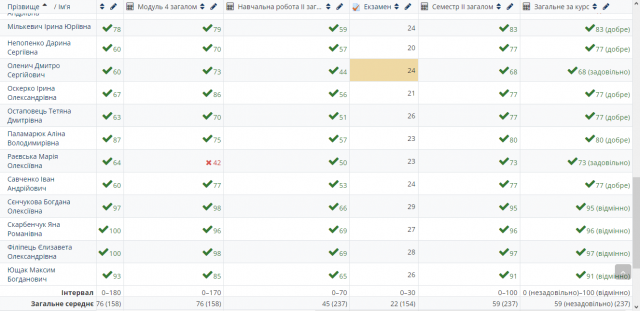 Академічна успішність студентів в цілому по курсу становить 85 %. Це студенти, які опанували викладені лекції, виконали завдання з лабораторних і самостійних робіт та успішно склали модулі. Інші 15 % студентів були недопущені до складання екзамену у зв’язку з невиконанням навчального плану.