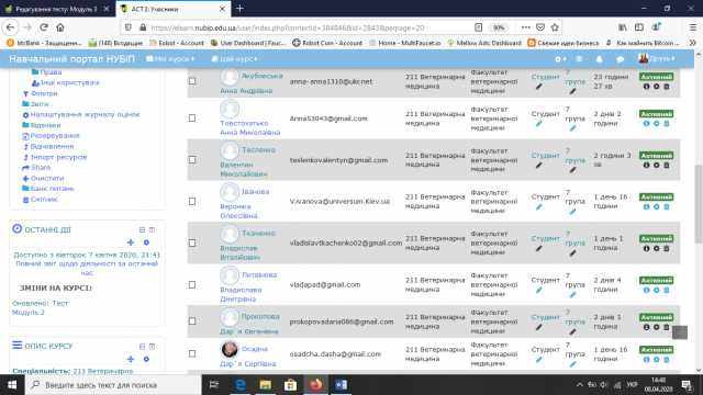 «Карантин – це не канікули!» Саме такого лозунгу дотримуються студенти першого курсу 7 групи факультету ветеринарної медицини. Під час карантину кафедра анатомії, гістології і патоморфології тварин ім. В. Г. Касьяненка, проводить дистанційне навчання на платформі ELEARN для студентів-ветеринарів 1-го курсу. За період карантину на курсі «Анатомія свійських тварин» студенти мають опрацювати теми: «Органи дихання в світлі їх розвитку і функції. Загальні принципи будови і функції органів дихання свійських тварин», «Органи сечовиділення у світлі філо- та онтогнезу. Нефрон. Прості та складні нирки. Загальна характеристика будови органів сечовиділення свійських тварин», «Органи чуття як рецепторні апарати аналізаторів зовнішнього середовища та джерело пізнання навколишнього середовища», «Особливості будови органів птахів».