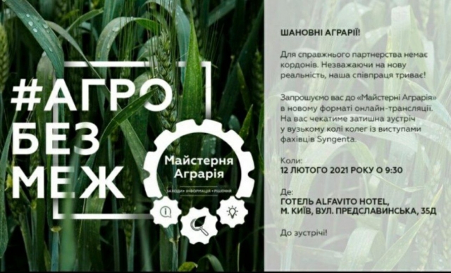 12 лютого відбулася конференція «Агробезмеж» у рамках комплексу навчальних заходів від компанії «Syngenta», головною метою якої було надати актуальну інформацію щодо того, що очікує на аграріїв у весняному сезоні. Конференція була розподілена на 4 блоки, кожен з яких був присвячений окремим сільськогосподарським культурам: зерновим, кукурудзі, соняшнику, сої та ріпаку. Спеціалісти «Syngenta» розповідали про актуальні способи захисту рослин від можливих проблем, таких як різноманітні хвороби, бур'яни та комахи.