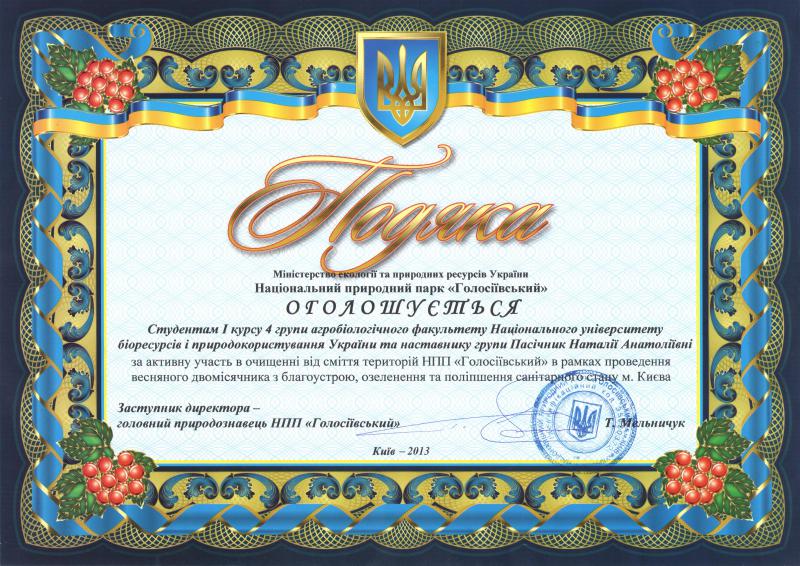Студенти агробіологічного факультету прибирають не лише територію свого університету, але й рідного Голосієва, зокрема його лісопаркової зони. Всі жителі й гості Голосієва милуються його красивим парком, студенти йдуть з гуртожитків на заняття повз велетні-дерева, які пам’ятають багато трагічних і радісних подій. Доглядати цю територію, підтримувати її в чистоті – наш обов’язок. «Ми завжди позитивно відгукуємося на звернення Голосіївській райдержадміністрації щодо допомоги у прибиранні території Національного природного парку «Голосіївський». Наш університет розташований на цій території, а отже це наш дім – кожного працівника й кожного студента» - говорить декан факультету Віктор Забалуєв.