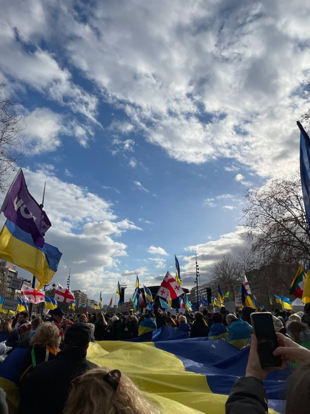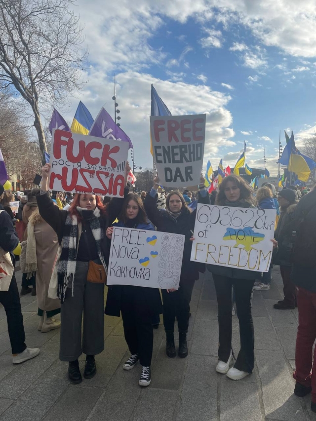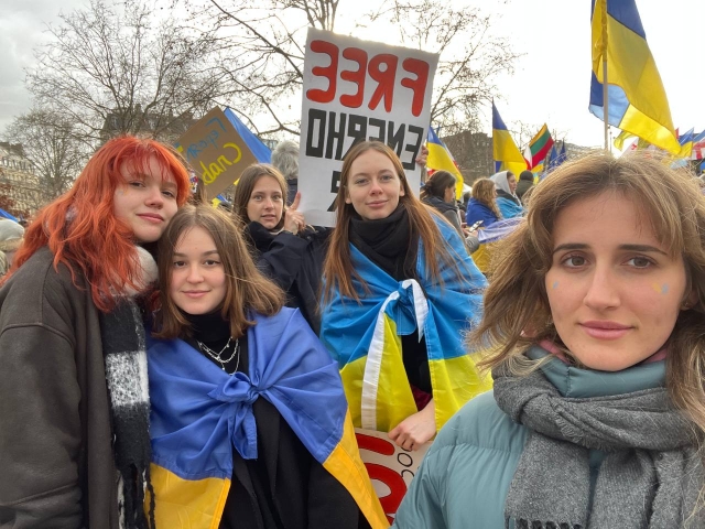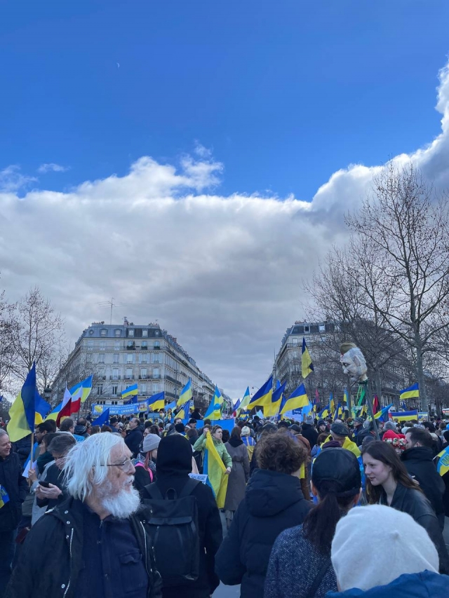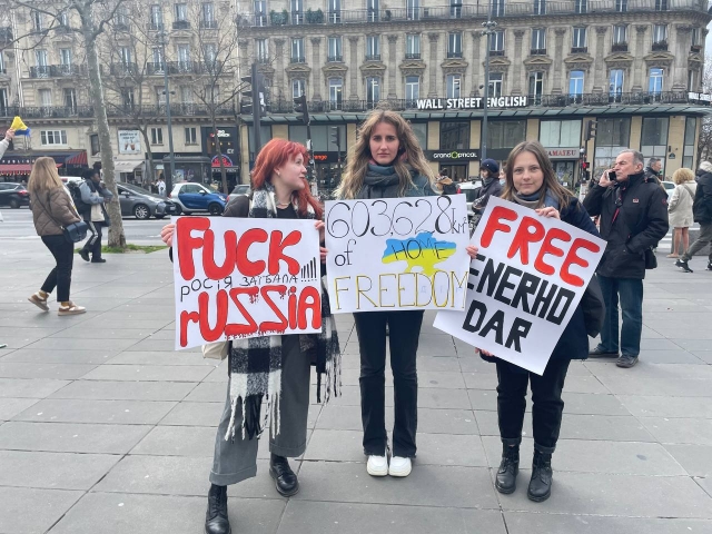 Париж, Лілль часто є центрами проведення мітингів в підтримку України. Надзвичайно зворушливо, коли ти бачиш як на фасаді мерії міста вивісили синьо-жовті прапори в знак солідарності з українським народом. Ейфелева вежа підсвічується з українським колоритом, чути, як звучить гімн України. Проведення і участь в таких заходах – не тільки звернення до місцевої влади про військову та економічну допомогу, але й нагадування світові: війна не закінчилася. Ми були приємно здивовані, скільки іноземців долучаються до таких заходів. Дуже приємно чути слова підтримки: «Ви не самі тут, ми з вами». Це неймовірне відчуття, що нас чують та світ з нами. В очах людей ми бачимо сльози й сум, але заразом рішучість і силу. Протестувальники підтримують Україну, демонструють свою свідому позицію та підтримку.