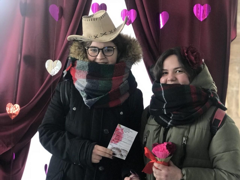Все було дуже урочисто. Червоно-біла арка, святкові свідоцтва, стрічки вірності, гадання на імена майбутніх наречених та побажання до свята. Свідки звичайно самі студенти, які погодилися зареєструвати свої почуття!