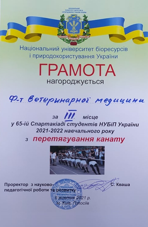 6 жовтня 2021 року студенти факультету ветеринарної медицини взяли участь у змаганнях з перетягування канату за програмою 65-ї Cпартакіади студентів НУБіП України 2021-2022 навчального року. Змагання відбувалися на стадіонs НУБіП України. Склад команди – 8 осіб незалежно від статі і ваги. Змагання проводилися за сіткою Winners (до двох поразок). Команди змагалися між собою до двох перемог.