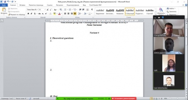 25 червня 2021 р. доцент кафедри адміністративного менеджменту та ЗЕД Олександр Файчук разом із к.е.н., доц. І.А. Міщенком дистанційно прийняли іспит у студентів магістратури спеціальності «Менеджмент ЗЕД»: Техоуа Кадіо Жан Амос (Tehoua Kadio Jean Amos) (Кот-д’Івуар) і Фадоджу Руф (Fadoju Ruth) (Нігерія) із дисципліни «Модель європейського регіонального розвитку» («Model of the European regional model»).