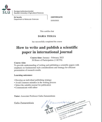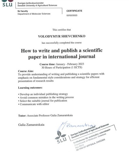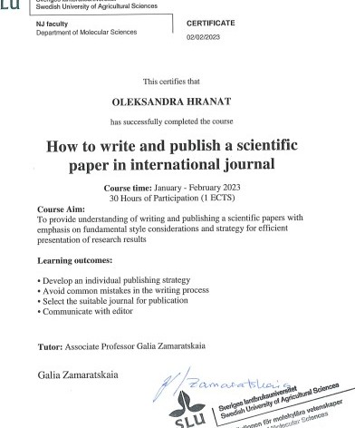 Кафедра технологій у птахівництві, свинарстві та вівчарстві сумлінно ставиться до постійного удосконалення способів та методів всебічного наукового розвитку студентства. Саме із студентської лави формуються майбутні світочі вітчизняної науки, а розгледіти в молоді «наукову іскру» та запалити її, справа спільної титанічної роботи науково-педагогічних працівників, наставників академічних груп, керівників студентських наукових гуртків та адміністрації університету. Однією з передумов розвитку науково спрямованої молоді є розуміння етичних норм, правил та механізму написання наукової статті. З метою формування якісних наукових навичок та умінь молоді з 26 січня по 2 лютого 2023 року відбулося он-лайн стажування в рамках проходження курсу на тему «Howtowriteandpublishascientificpaperininternationaljournal» («Як написати та опублікувати наукову статтю в міжнародному журналі») загальним обсягом 30 годин. Курс провела професор Шведського університету сільськогосподарських наук (м. Уппсала), Галія Замарацька. Студенти кафедри Олександра Гранат, Дарія Тесля, Володимир Шевченко, Олександр Куліш, які мають на меті продовження наукової та дослідницької діяльності, вдало пройшли навчання та отримали міжнародні сертифікати. Майбутні вчені здобули компетентності та навички пошуку наукового видання для публікації власних доробків, ознайомлені з правилами побудови статті та стилю написання, отримали розуміння про співавторство, засвоїли правила доброчесності, важливі аспекти спілкування з редактором та багато інших «неписаних» правил етики у науковому світі.