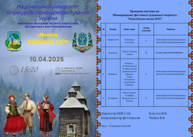 Однією з найяскравіших подій цьогорічного фестивалю стала участь студентів Навчально-наукового інституту енергетики, автоматики і енергозбереження, які з особливою гордістю та неповторним колоритом представили мистецьку спадщину українського Полісся на сцені XLI Міжнародного фестивалю художньої творчості "Голосіївська весна – 2025". Студентський колектив під керівництвом старшого викладача кафедри культурології Владислави ЧАЙКИ, голови Сенату студентської організації ННІ енергетики, автоматики і енергозбереження Анастасії ЧУГАЄВОЇ та заступника директора інституту з виховної роботи Вячеслава ВАСЮКА підготував змістовну й колоритну програму, що викликала щире захоплення глядачів і яскраво передала дух та традиції поліського краю. Особливо емоційною стала театральна академічна постановка за мотивами повісті «Кайдашева сім’я» Івана НЕЧУЯ-ЛЕВИЦЬКОГО. Студенти майстерно втілили образи класичних персонажів: Марія Панченко (ЕЕЕ-24001б) – Мелашка, Роксолана Лазівська (ЕЕЕ-24001б) – Мотря, Тімур Ковальчук (ЕЕЕ-24001б) – Лаврін, Богдан Лисаченко (ЕЕЕ-24001б) – Карпо, Анастасія Бузаєва (ЕЕЕ-21002б) – баба Параска, Анастасія Чугаєва (ІЕС-22001б) – баба Палажка, Катерина Гошта (ТЕ-23001б) – Маруся Кайдашиха та Роман Майса (ЕЕЕ-24002б) – Омелько Кайдаш. Їх переконлива гра нагадала про історичні й культурні особливості українського Полісся, акцентуючи увагу на регіональному колориті.