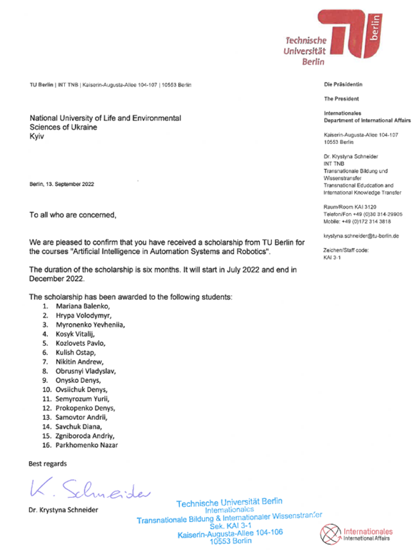 Саме за поданням Наталії Заєць, щоб підтримати кращих студентів, які зараз опановують курс лекцій з штучного інтелекту в автоматизації та робототехніці, Берлінський технічний університет та Німецька служба академічних обмінів організували стипендіальний грошовий фонд.