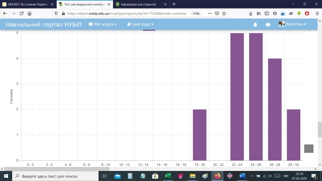 Тест складали 18 студентів (із 21), що складає 86%. Результати тестування показали, що середня оцінка в групі була 24 бали, що на 4 (20%) - вище за середній бал, отриманий ними при написанні попереднього модулю. Аналіз засвідчив, що цього разу найвищої оцінки за тест (30 балів) не отримав жоден студент (минулого разу - один). Про те і низьких балів (<10) – не було (минулого разу у 2 студентів). Всі роботи були оцінені в межах 18-28 балів, що свідчить про очевидне покращення успішності на курсі.