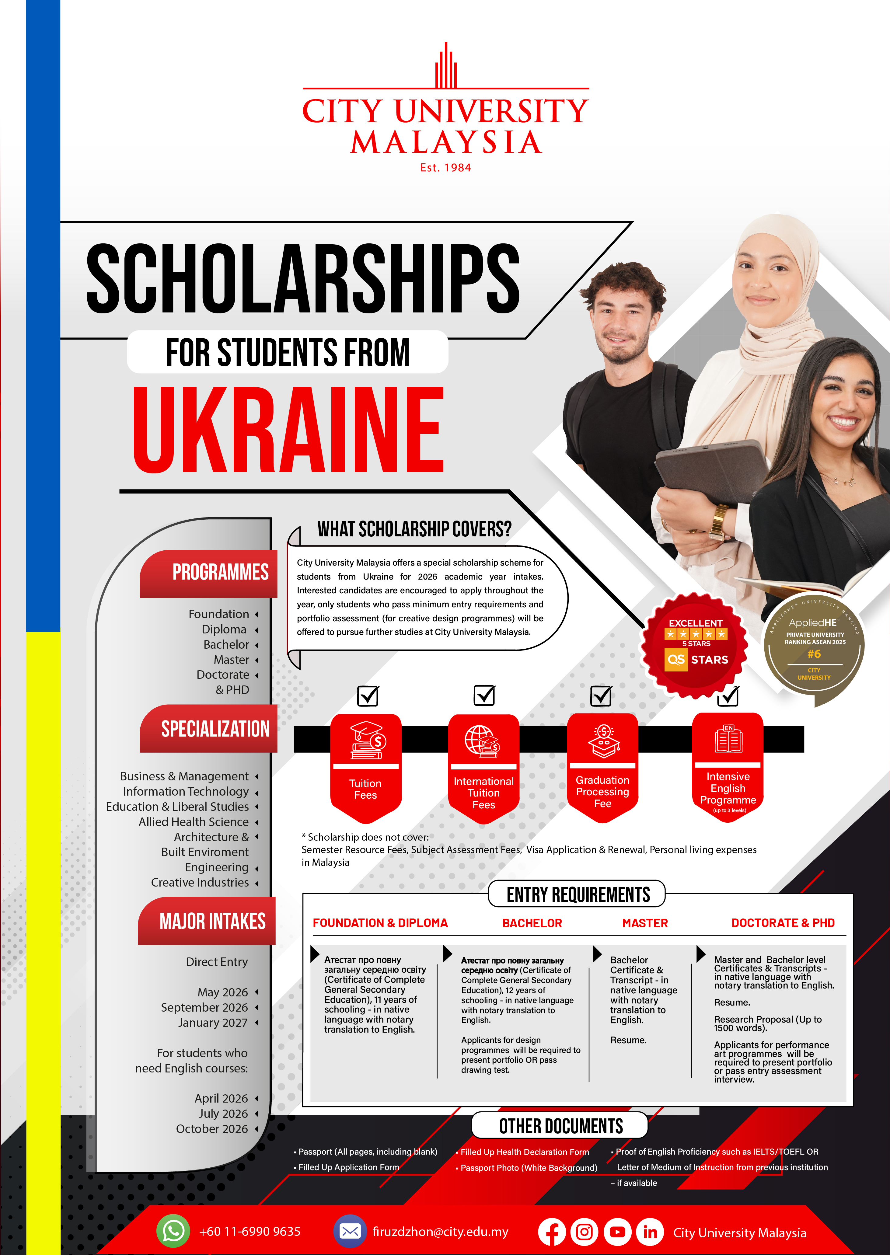 Для подання заявки на отримання стипендії можна звертатися до Ольги Цілик з Відділу міжнародного маркетингу City University Malaysia за електронною адресою [email protected] або [email protected].