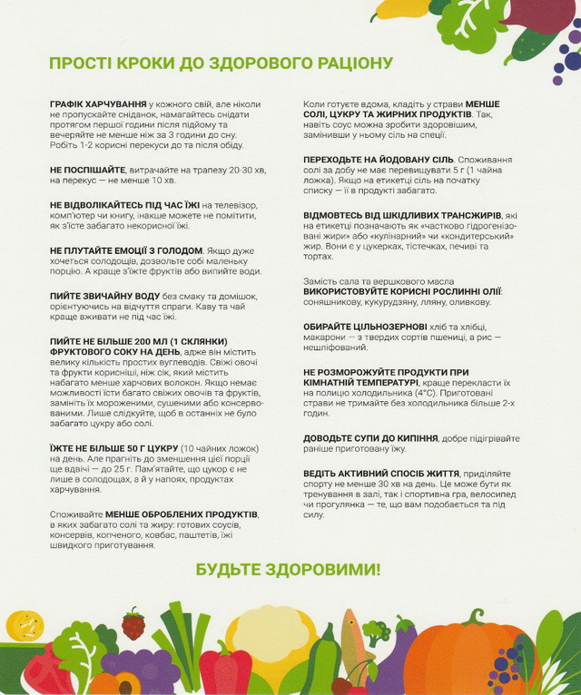 Окремо він сконцентрував увагу на негативних наслідках нездорового харчування, як одного з ключових чинників ризику виникнення неінфекційних хвороб, що має бути в полі зору не тільки фахівців-медиків, а й суспільства в цілому. Крім того, була приділена увага відносно недавно затвердженій так званій "тарілці здорового харчування", яка включає в себе рекомендації по харчуванню українців та сформована виходячи з ментальних особливостей і культури їжі, до якої ми звикли.
