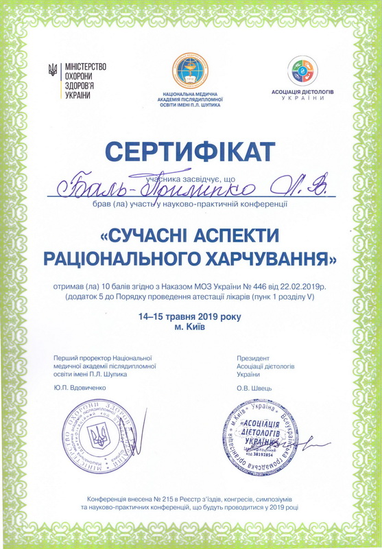14-15 травня 209 р. відбулась науково-практична конференція «Сучасні аспекти раціонального харчування» за участю Міністерства охорони здоров'я України, Асоціації дієтологів України, Національної медичної академії післядипломної освіти імені П.Л. Шупика, Групи компаній «МедЕксперт» та Національного університету біоресурсів та природокористування України.