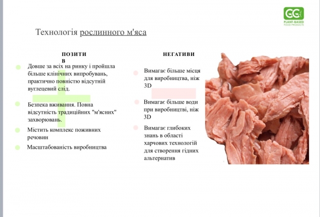 Останній трендом, про які було згадано, - це технології рослинного м’яса. Інноваційна розробка унікальна не тільки для українського споживача, а й для всього світу, адже альтернатив справжньому цільному шматку м'яса - майже не існує. Проаналізувавши актуальні харчові тренди стало зрозумілим, що вироби на рослинній основі потребують уваги з боку вдосконалення технологій та створення більш різноманітного асортименту.