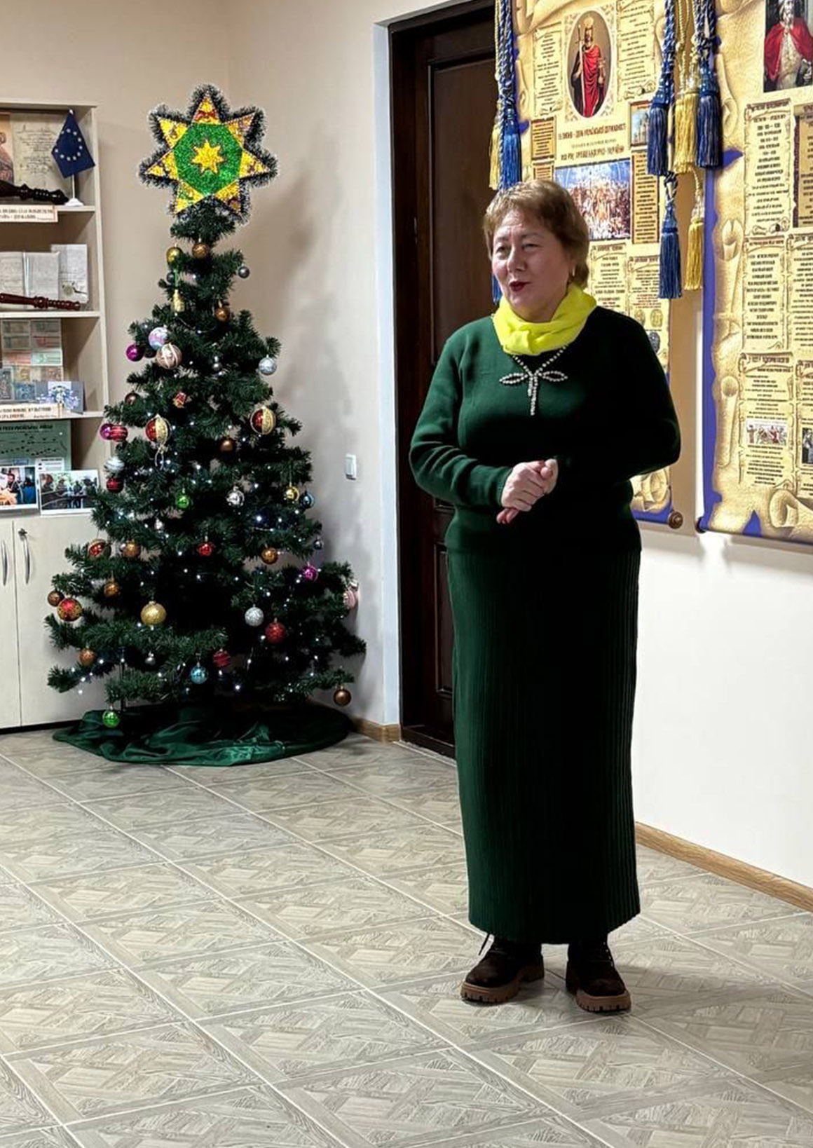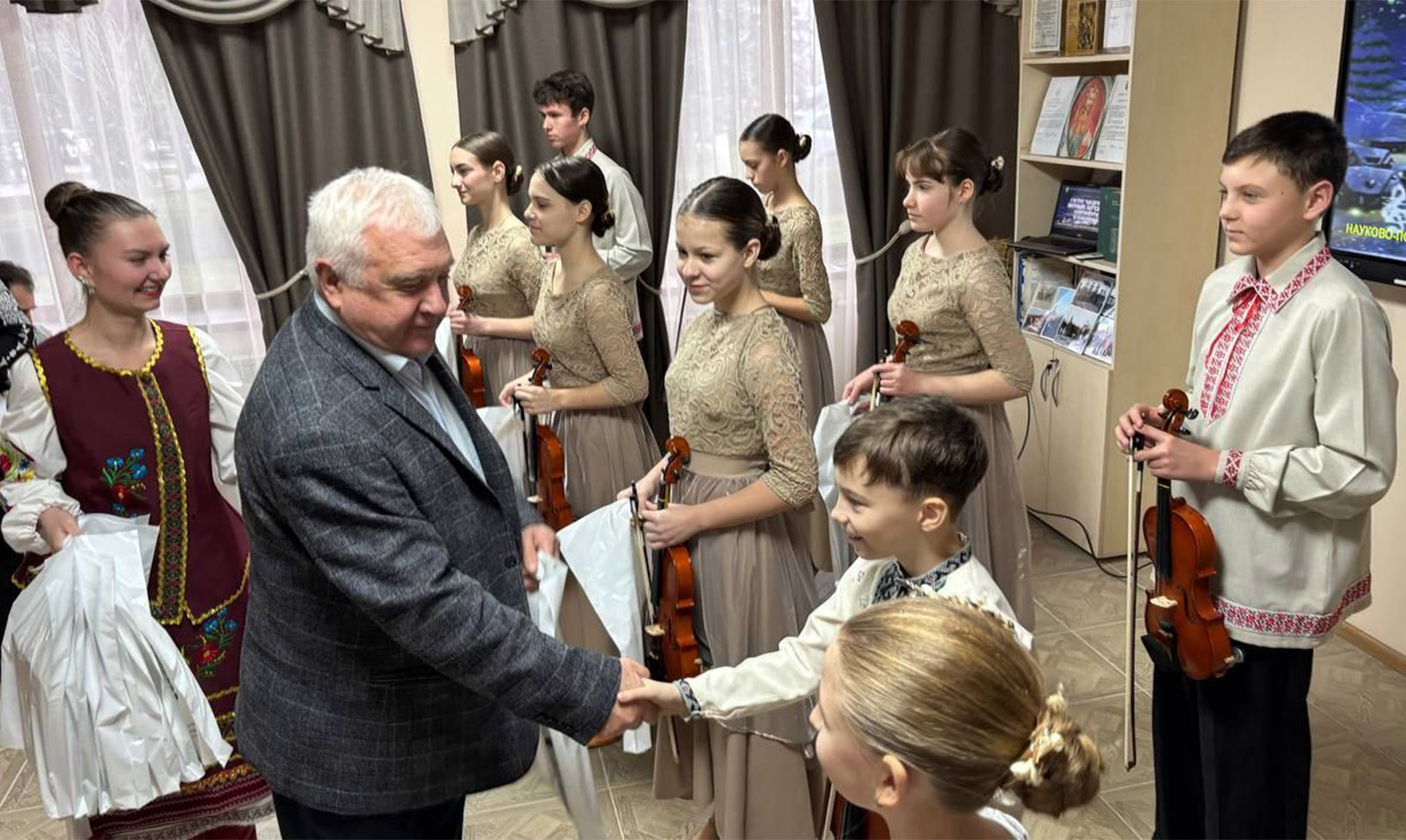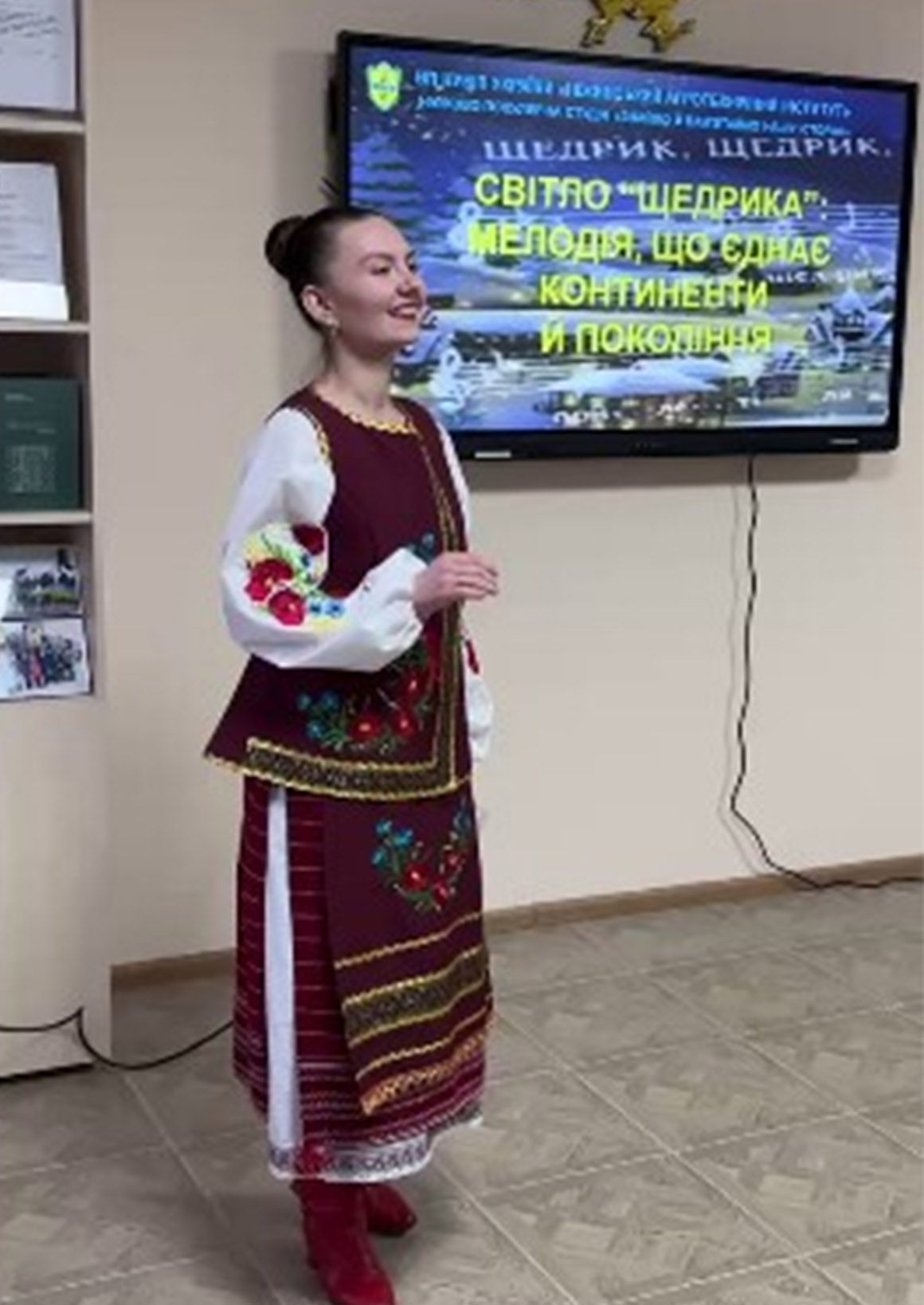 Під гучні оплески, що супроводжували натхненний виступ ансамблю скрипалів, до слова було запрошено шановну гостю — директора Ніжинської хореографічної школи Галину ТИМОШЕНКО. Вона щиро подякувала директору інституту Василю ЛУКАЧУ за запрошення, теплий прийом та солодкі подарунки, що додали святкового настрою юним артистам. Окремі слова вдячності пролунали на адресу Тетяни ШАХРАЙ, завідувачки лабораторії національно-патріотичного виховання та керівника студії «Знаймо і пам’ятаймо нашу історію». Галина Львівна наголосила, що надзвичайно приємно, що саме студенти долучаються до такого глибокого науково-творчого пошуку. Завдяки їхній праці присутні відкрили для себе нові цікаві факти, які дають привід ще більше пишатися Україною та нашим народом. Також гостя висловила щире захоплення атмосферою Світлиці Української Державності, яка надихає молодь на вивчення власної історії. На завершення Галину ТИМОШЕНКО підсумувала, що справжньою окрасою зустрічі став музичний діалог двох колективів. Символізм моменту підкреслило виконання безсмертного «Щедрика»: спершу шедевр пролунав у майстерному акапельному виконанні художньої керівниці Наталії ПАНАС (за що гостя висловила окрему вдячність), а у відповідь ансамбль скрипалів «Рондо» представив свою вишукану інструментальну версію. Це стало яскравим свідченням того, що українська культура є тією могутньою силою, яка об'єднує покоління, навчальні заклади та серця!
