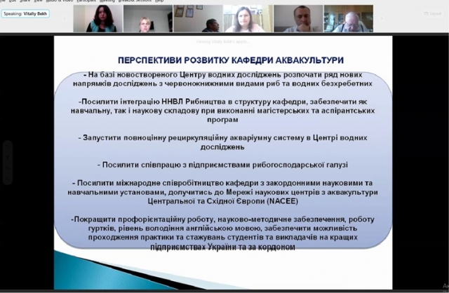 Про головні досягнення кафедри аквакультури та перспективи її розвитку на майбутнє розповів завідувач кафедри, д.с.-г.н., професор Віталій Бех. Він наголосив, що на кафедрі сформувався потужний науковий потенціал, що включає досвідчених викладачів та перспективну молодь, яка є рушійною силою кафедри. Крім того, значні перспективи постають перед кафедрою і з відкриттям Навчально-науково-виробничого центру водних біоресурсів та аквакультури, який відкриє доступ до різноманітних наукових досліджень.