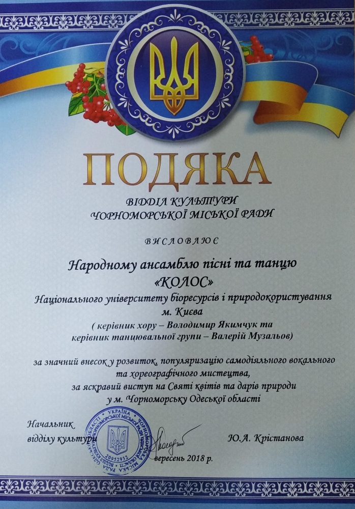 Цього вересня наш дружний студентський колектив народного ансамблю пісні і танцю "Колос" ім. Станіслава Семеновського НУБіП України традиційно відвідав Чорноморськ. Ранній підйом, зарядка на прохолодному морському повітрі, освіжаючий заплив і сніданок на швидку руку – стали атрибутами вдалого ранку. Погода мало радувала, проте, ми були разом і натомість мали вдосталь часу, щоб поринути у творчий процес. Щоденна праця – робота над новим матеріалом, відпрацювання існуючого, і, зокрема, підготовка до виступу на традиційному "Святі квітів" у Чорноморську – не була марною. Публіка прийняла колектив тепло та емоційно. Хто - підспівував разом із хором, хто - підтанцьовував разом із балетом, а хто і навпаки. Головне, що всі, об'єднані любов'ю до народного мистецтва, посміхались.