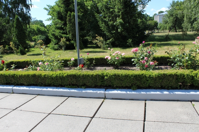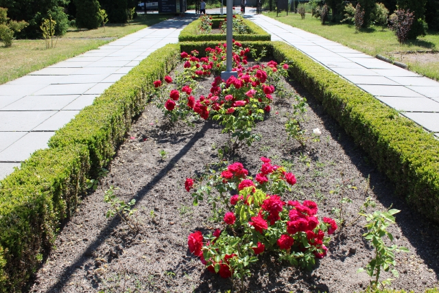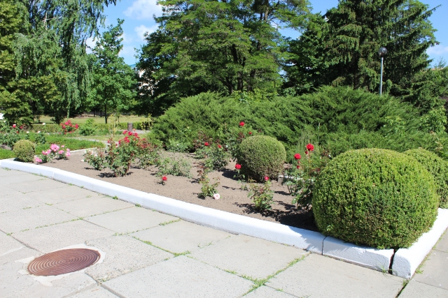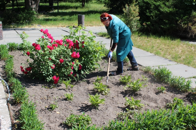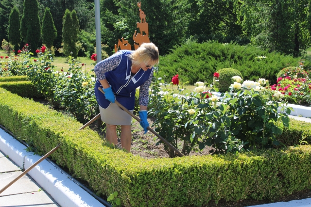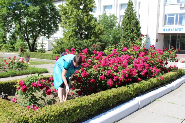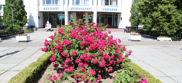 Клумби і газони тут буквально буяють розмаїттям квітів, серед яких панують троянди. Вперше вони з’явилися тут років п’ятнадцять тому, як то кажуть, прижилися, а коли який кущ і чахне - натомість з’являється новий. Звісно, весь цей розарій потребує щоденного догляду, тож роботи вистачає. Добре, що постійно допомагають студенти та співробітники факультету ветеринарної медицини.