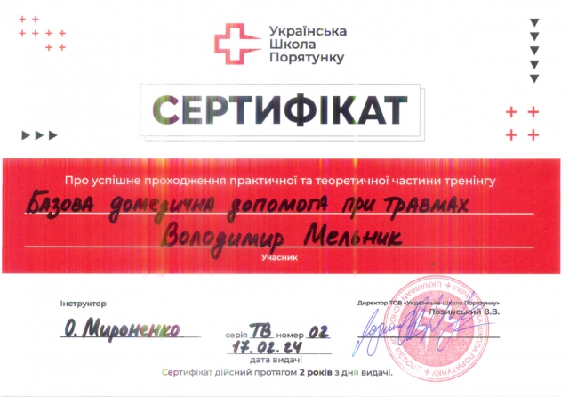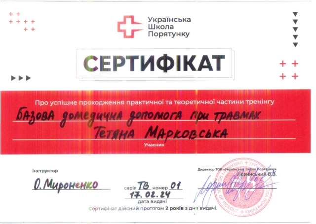 17 лютого 2024 року співробітники кафедри епізоотології, мікробіології і вірусології, а саме, завідувач кафедри Володимир Мельник та лікар ветеринарної медицини кафедри Тетяна Марковська, на базі навчально-тренінгової організації «Українська школа порятунку», пройшли теоретичне навчання та практичне відпрацювання надання Базової домедичної допомоги при травмах різного ступеня «UKRAINIAN PREMEDICAL TRAUMA CARE. BASIC COURSE». Тренінг побудований за рекомендаціями чинних нормативів та медичної доказової практики.