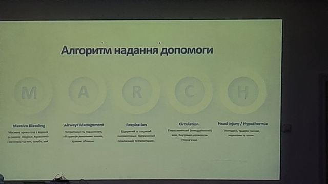 На занятті було розглянуто алгоритми надання допомоги в різних ситуаціях при наявності різних критичних станів та травм (алгоритм M.A.R.C.H.). Навчання було наповнене великою кількістю практики, що була досить ефективно поєднана з теорією, що дало можливість ефективно закріпити отримані навички. Наприкінці тренінгу учасників очікував іспит - “симуляція” – сценарне відпрацювання при наявності стрес-фактору, за результатами якого було отримано відповідні сертифікати.