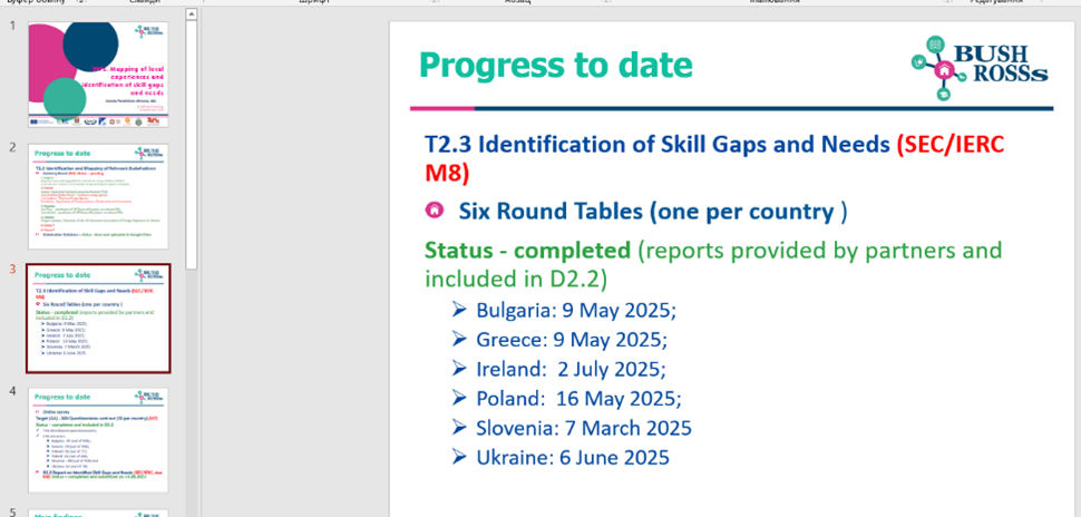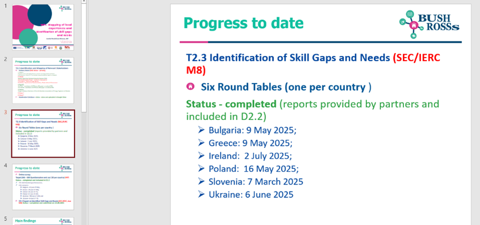 У рамках WP2: Відображення місцевого досвіду та виявлення прогалин у навичках і потребах партнери представили звіт з опитувань і круглих столів, що дозволяють окреслити поточний стан енергомодернізації у країнах і визначити напрями для вдосконалення компетенцій учасників ринку.
