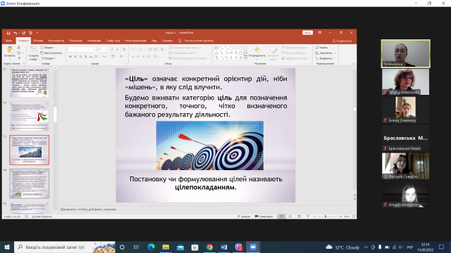 Аліна Василівна представила студентам етапи процесу цілепокладання з детальним роз’ясненням кожного етапу та зазначила, що цілепокладання – безперервний процес, тому що ще в процесі досягнення мети народжуються нові ідеї. Також були розглянуті помилки і проблеми цілепокладання.