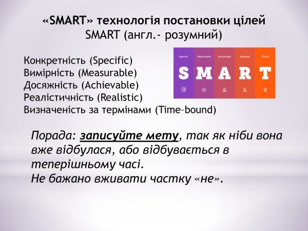 Розкриваючи зміст третього пункту плану, Троян А.В. ознайомила здобувачів вищої освіти з популярними методиками цілепокладання. Серед них «SMART» технологія постановки цілей; методика «Дерево цілей», що характеризується зв’язками між цілями системи і засобами їх досягнення, під якими розуміють рівні цілей; колесо балансу, інтелект-карти; Піраміда Франкліна (Піраміда особистої ефективності).