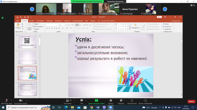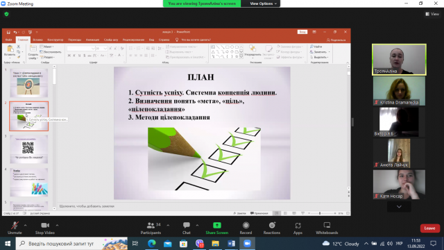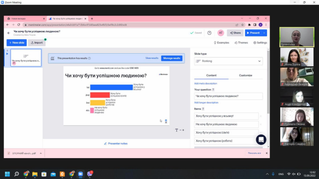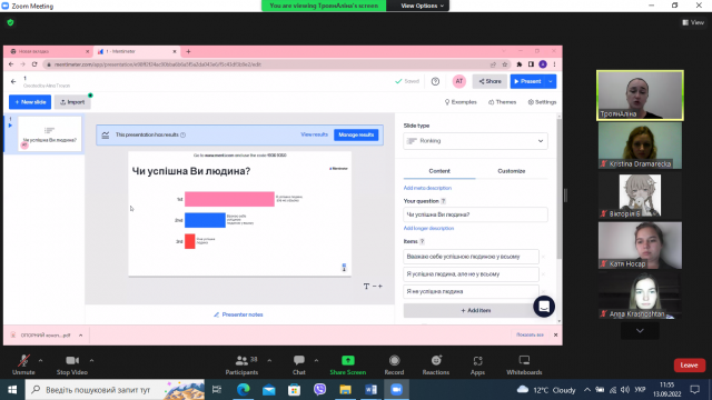 Представивши перелік питань, що будуть розкриті в даній лекції, Аліна Василівна, використовуючи сервіс онлайнових опитувань Mentimetr, провела опитування присутніх щодо оцінки своєї успішності на даний момент і бажання бути успішним в майбутньому.
