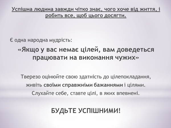 Обов’язковою умовою успіху є наявність чіткої цілі. Дослідження свідчать, що успішні люди завжди мають цілі і знаходять ефективні шляхи їх досягнення.