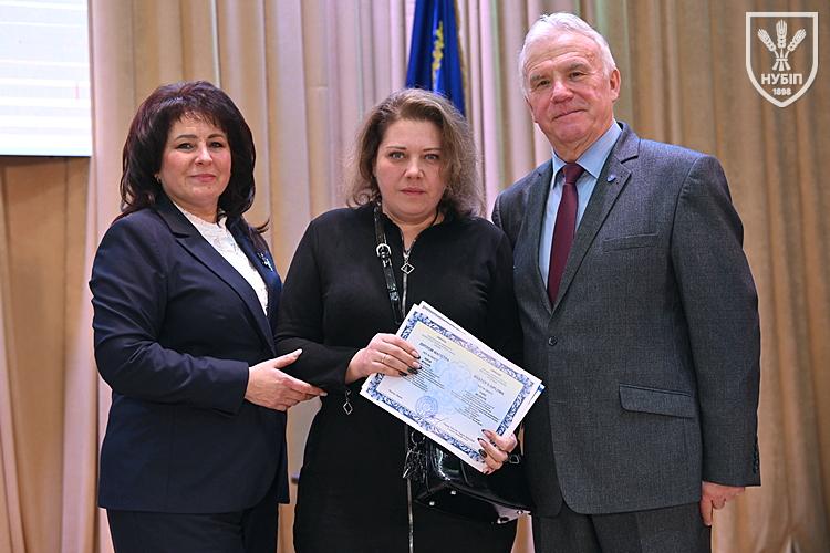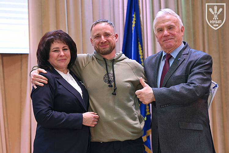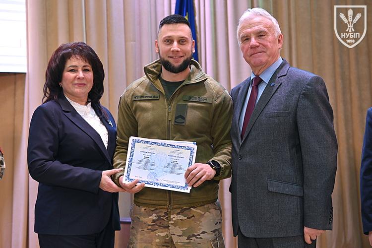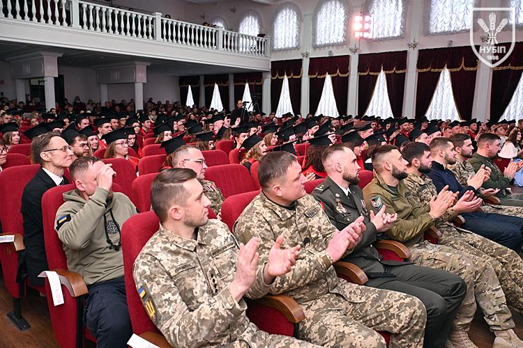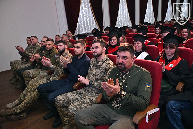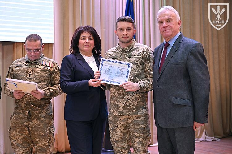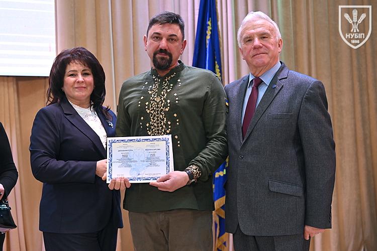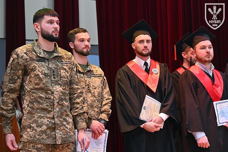 Десятеро доблесних захисників, які знайшли можливість особисто приїхати на урочисту подію вручення. Дипломи захисникам вручили президент університету Станіслав Ніколаєнко та декан факультету Інна Савицька. Зокрема, отримала диплом дружина випускника Юрія Мушляка, який наразі перебуває на фронті - Ірина.