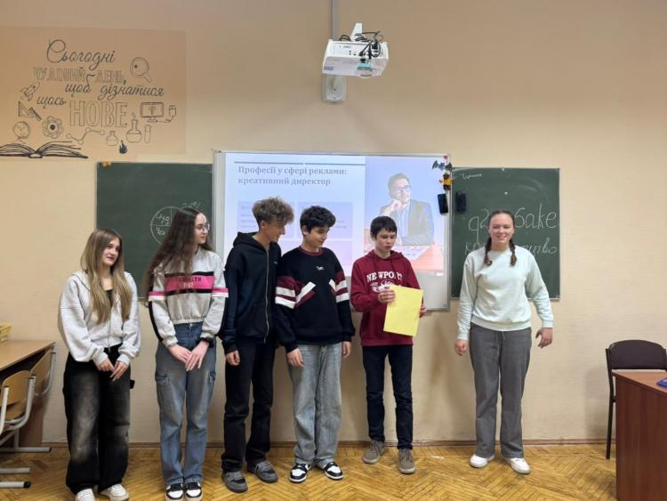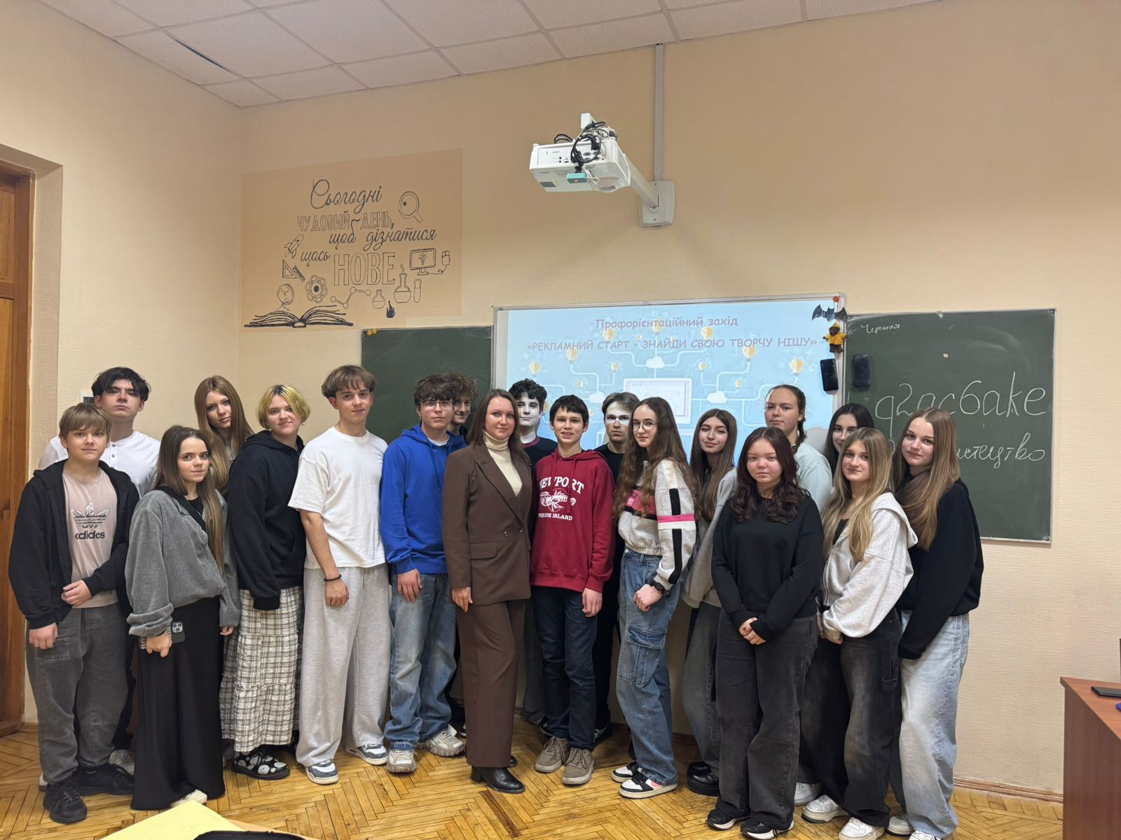 У межах профорієнтаційного майстер-класу «Рекламний старт — знайди свою творчу нішу», який провела завідувачка відділення Ірина ВІННИК для учнів 9-А класу Ірпінського академічного ліцею НУБіП України, школярі спробували себе в ролях копірайтерів, дизайнерів та SMM-спеціалістів. Вони створювали слогани, логотипи та контент-плани для уявних брендів. Така діяльність допомагає майбутнім вступникам усвідомити професійні інтереси та впевненіше обирати освітню траєкторію.